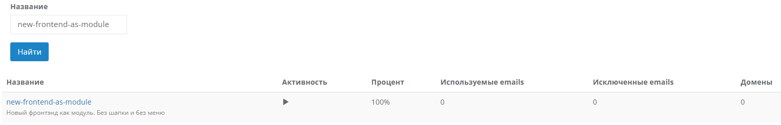 - в поле Процент установите значение -- 100, в блоке Домены добавьте все необходимые домены, где будет включена фича: