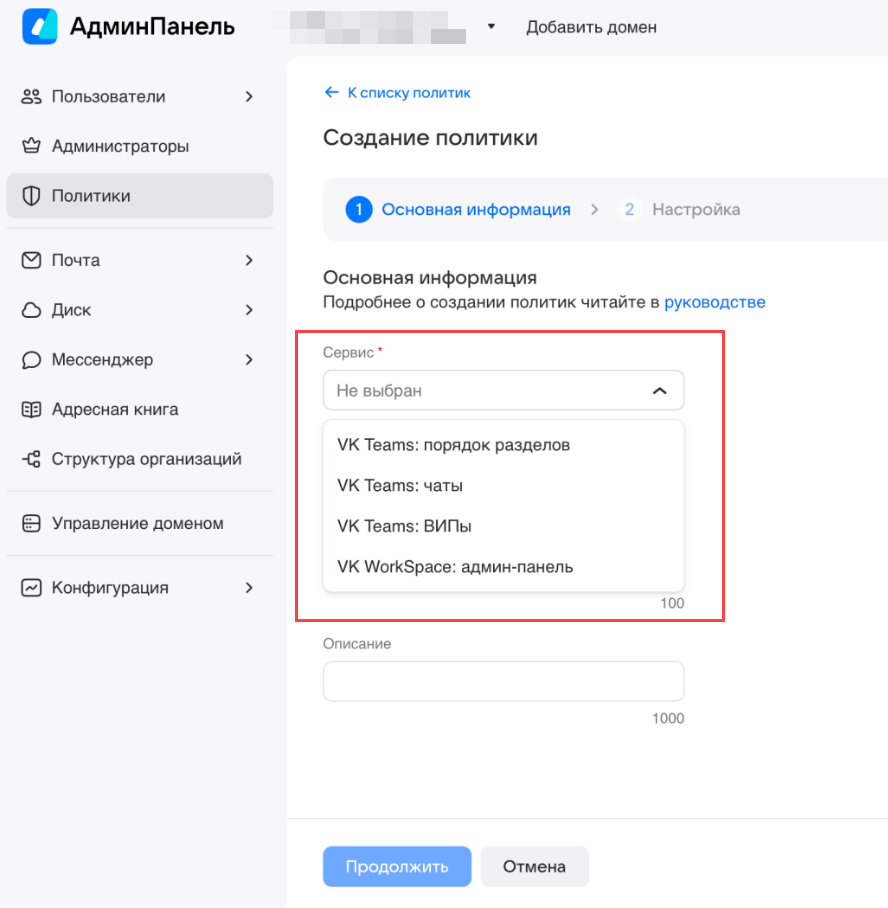 Перед выполнением шагов 3 и 4 перейдите в Панель администратора VK WorkSpace и попробуйте создать групповую политику. Убедитесь, что выпадающие списки полей Сервис и Шаблон не пустые: