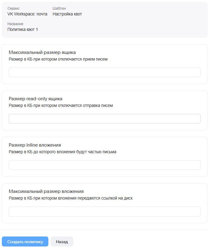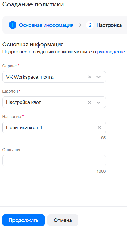 Заполните форму создания политики: выберите сервис VK WorkSpace: Почта и шаблон Настройка квот, заполните поле Название. Нажмите Продолжить.