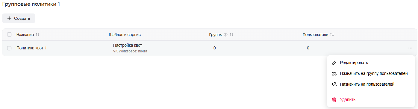 - В меню Панели администратора перейдите в раздел Политики и нажмите на кнопку Создать.