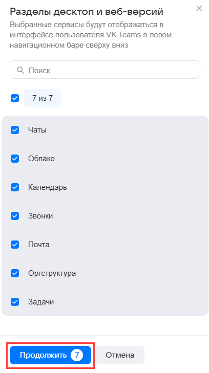 Выберите сервисы, которые будут отображаться в десктоп и веб-версии приложения, затем нажмите на кнопку Продолжить: