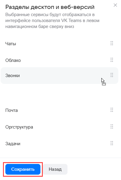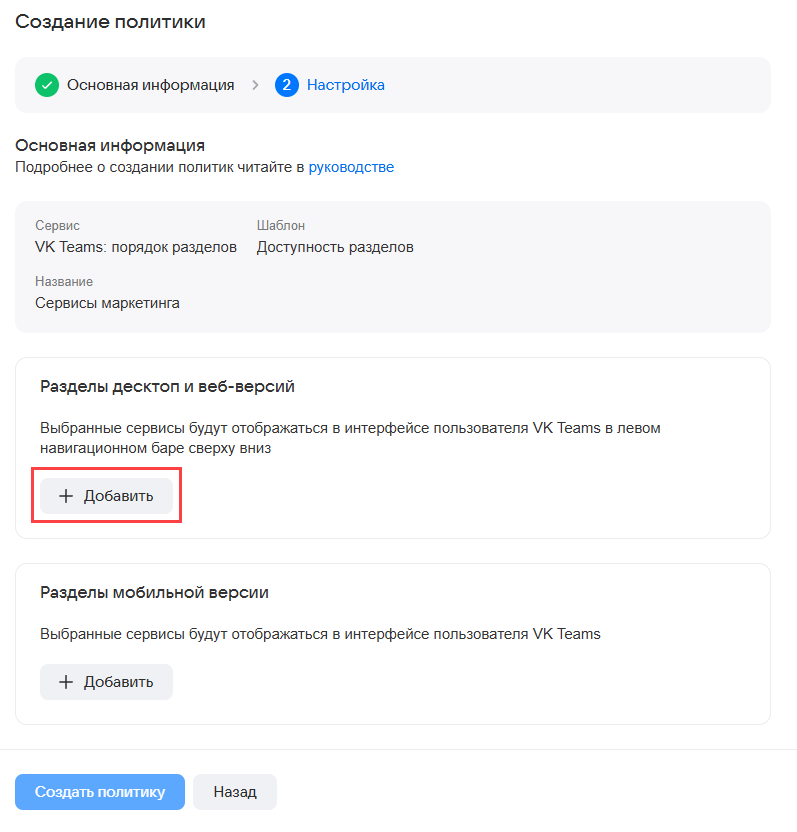 Чтобы настроить отображение сервисов в десктоп и веб-версии, нажмите на кнопку Добавить в блоке Разделы десктоп и веб-версий: