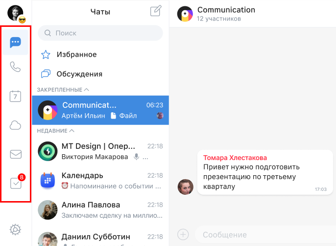 Разделы — это стандартные сервисы внутри приложения: Чаты, Звонки, Почта, Календарь, Задачи и мини-аппы. По умолчанию разделы у пользователей отображаются в соответствии с настройками в конфигурации инсталляции.