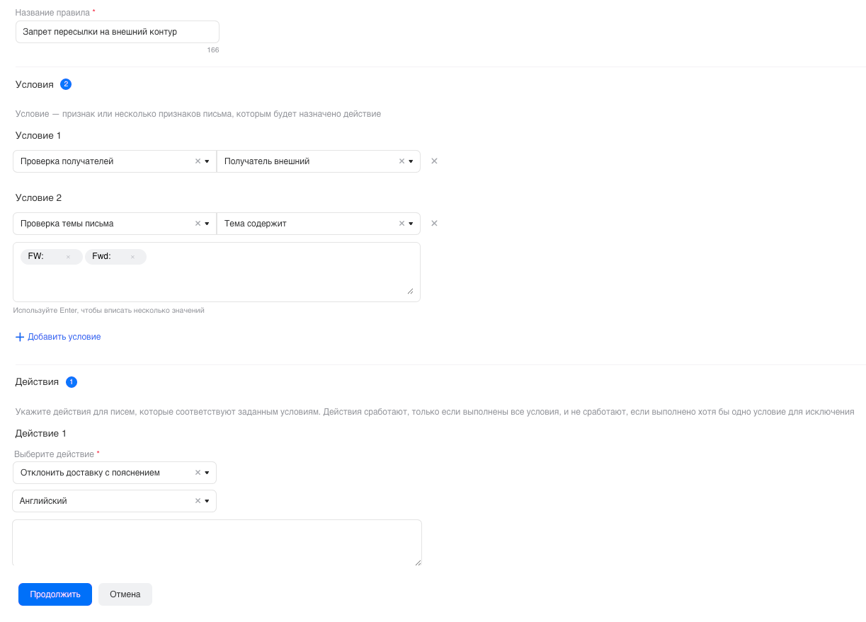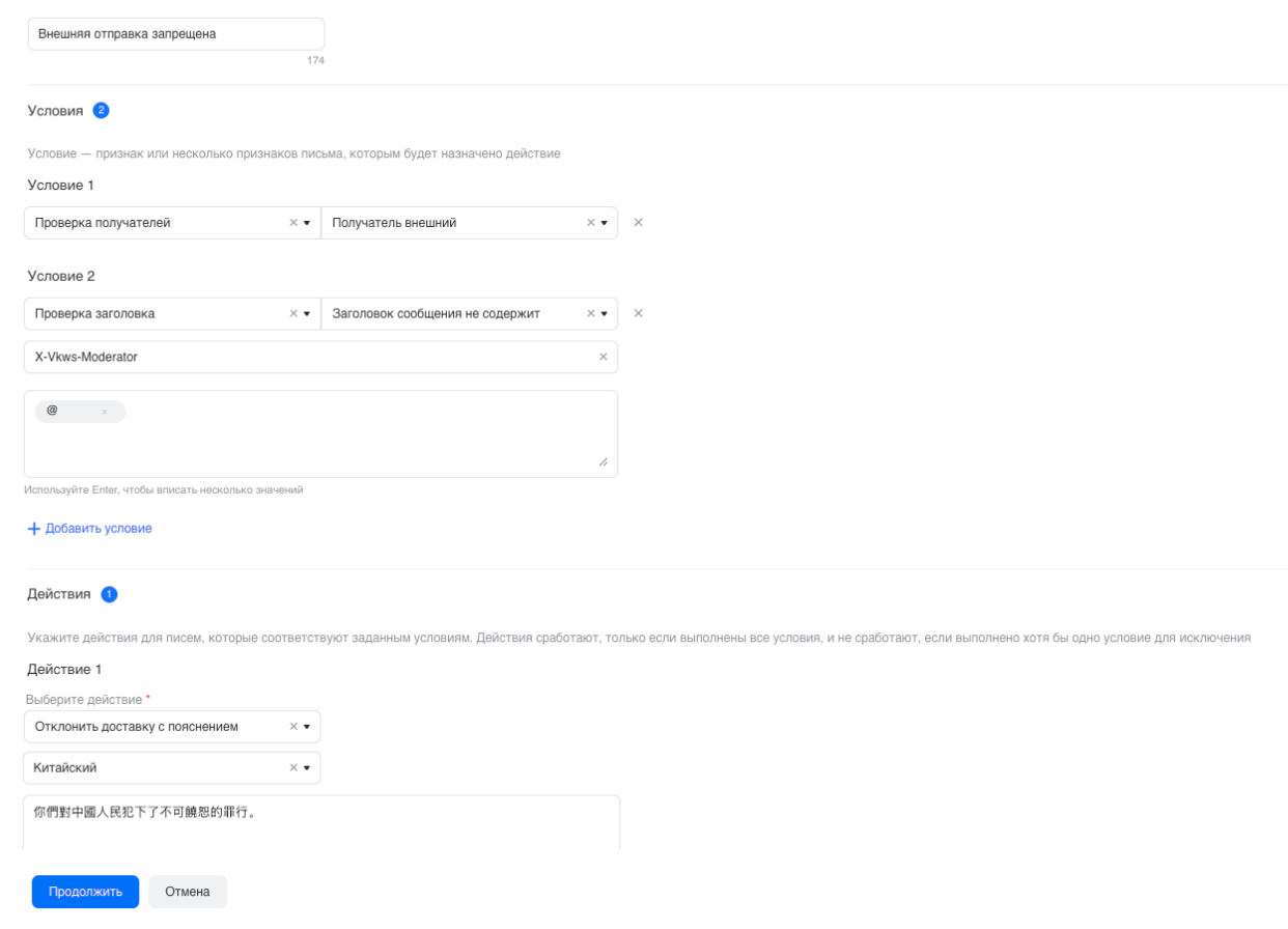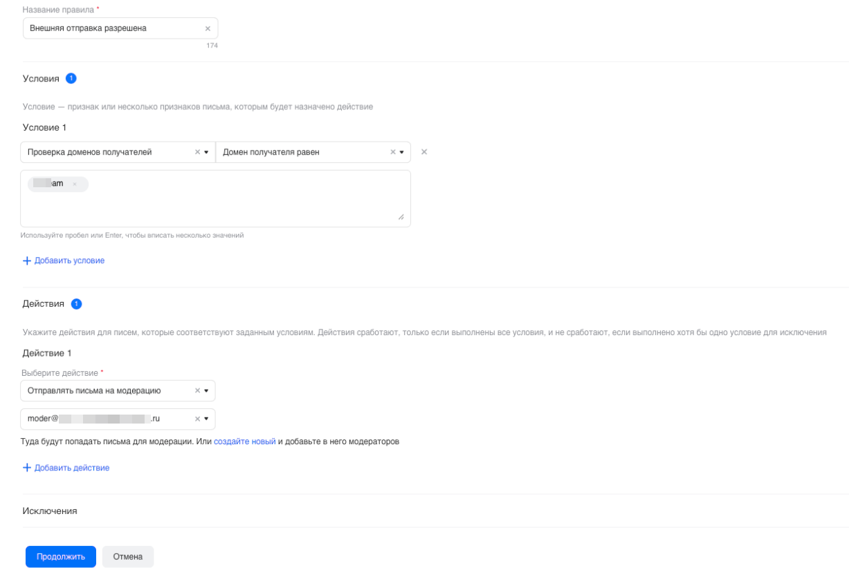 Наиболее гибкое правило — вы можете указать определенные домены или адреса, на которые разрешена отправка почтовых сообщений. Вы можете задать необходимые вам настройки через создание условий и действий для писем.