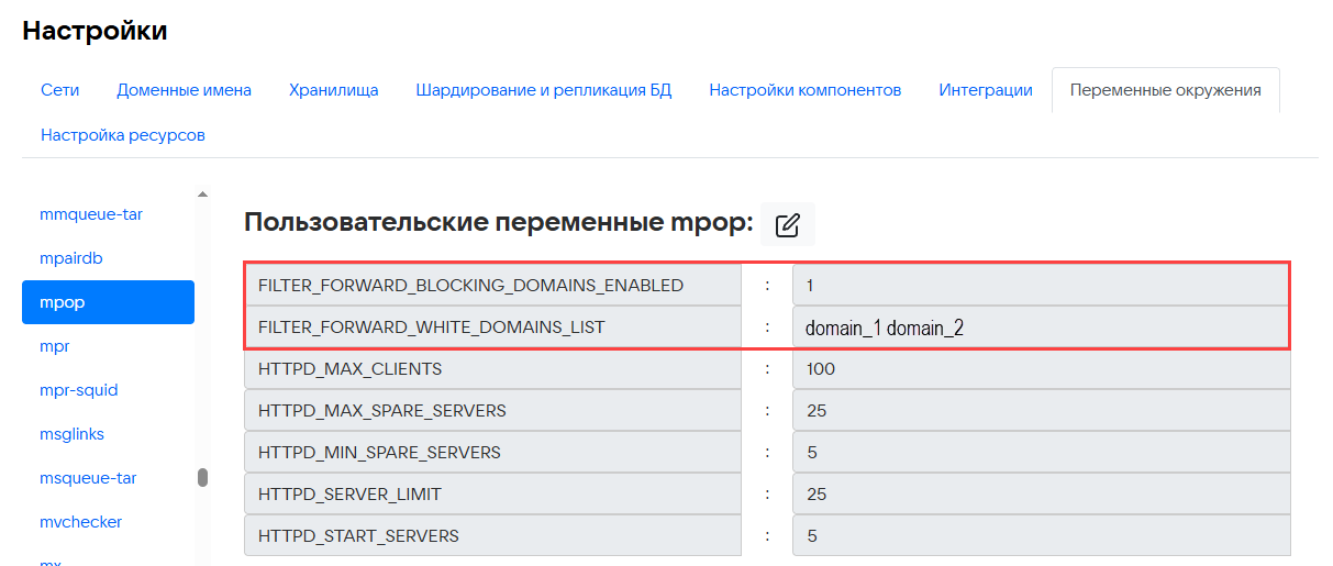 Для переменной FILTER_FORWARD_WHITE_DOMAINS_LIST укажите через пробел домены, для которых разрешено создание фильтров на пересылку, в том числе внутренние домены компании и текущий домен:
