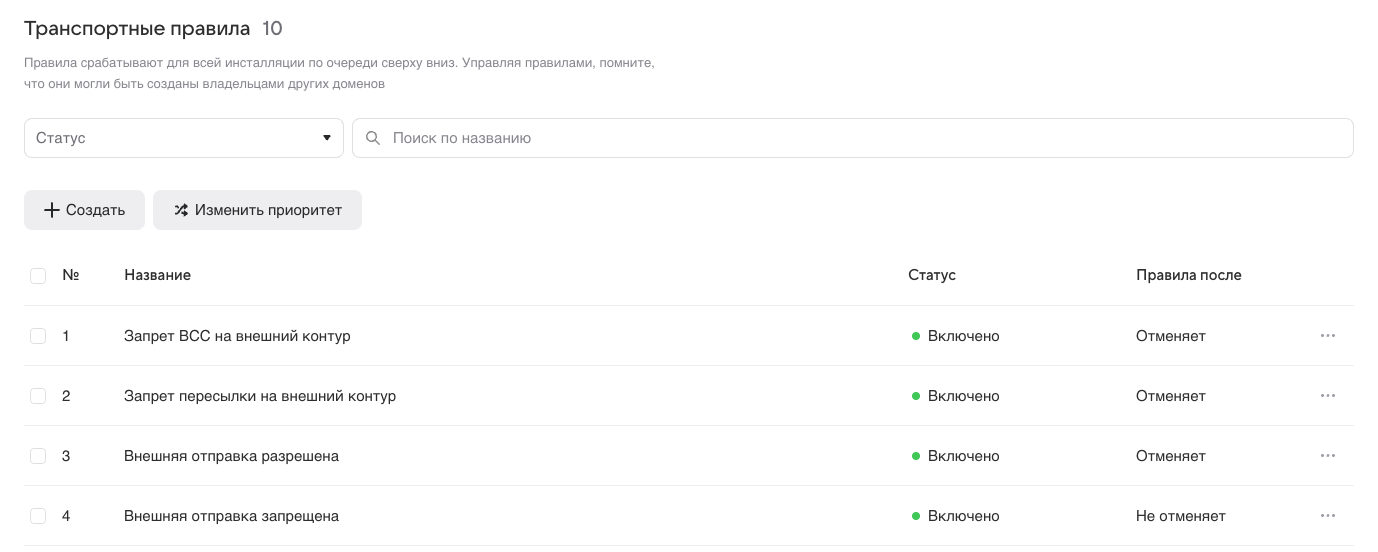 Приоритет транспортного правила — это очередность его выполнения. Проверьте, что очередность выполнения созданных правил соответствует очередности на скриншоте ниже: