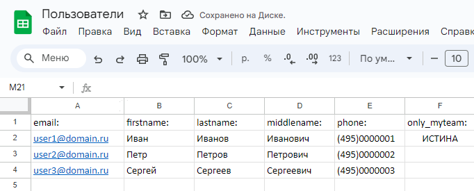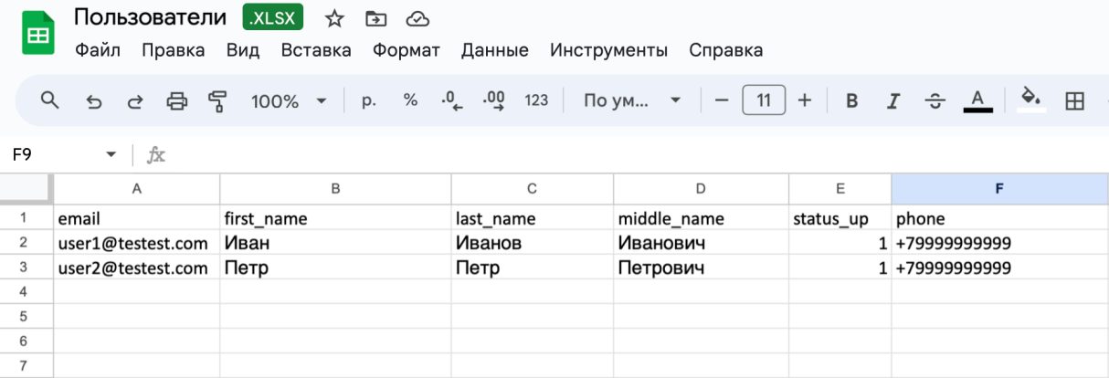 Создать файл можно в любой программе, работающей с таблицами: например, MS Exсel или Google Таблицы. Таблица должна иметь такую структуру: