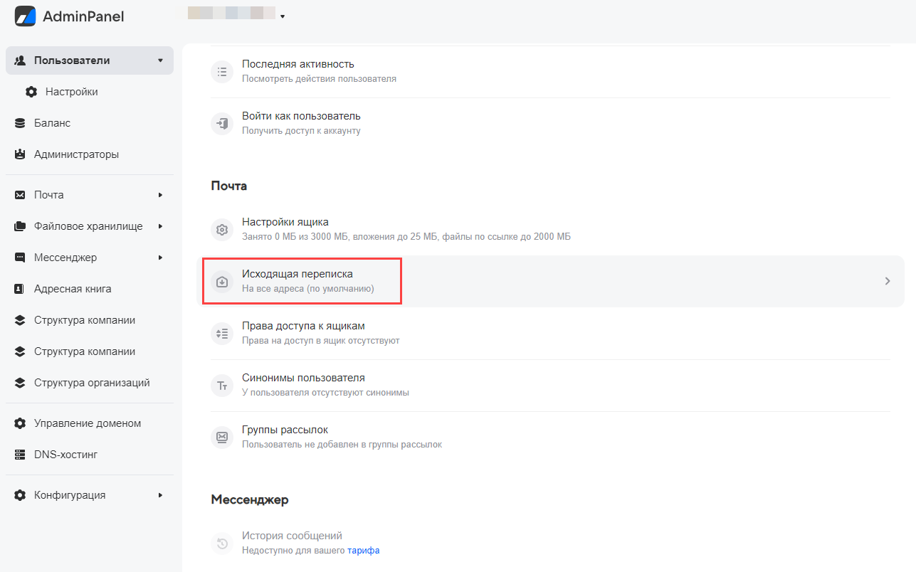 Ограничить исходящую переписку также можно для одного пользователя. Для этого выполните следующие действия: