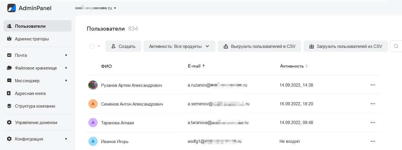 Помимо массового добавления (импорта) пользователей также доступен экспорт всех пользователей в виде списка в файле формата CSV. Для этого в разделе Пользователи нажмите Выгрузить пользователей в CSV. В файле будут собраны следующие данные: ФИО, email, дата создания, последняя активность (дата и время), пометка о блокировке, группа, в которую входит пользователь, и др.