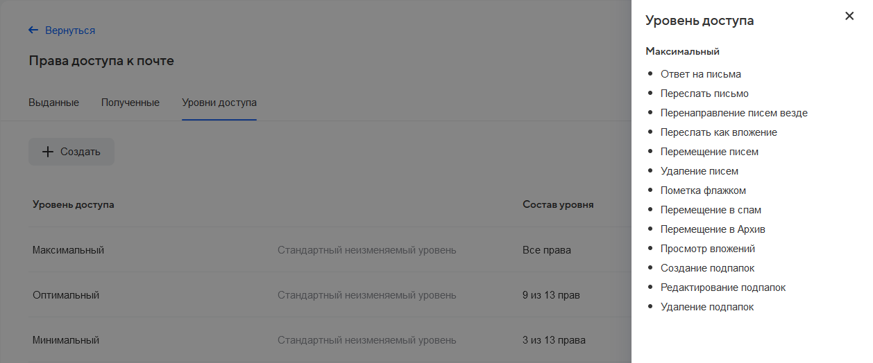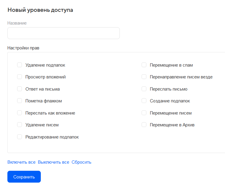 - максимальный — перемещение писем, создание подпапок, редактирование подпапок, просмотр вложений, удаление подпапок, пересылка письма в виде вложения, ответ на письма, пометка флажком, пересылка письма, перемещение в архив, перемещение в спам, перемещение писем, перенаправление писем везде, удаление писем.
