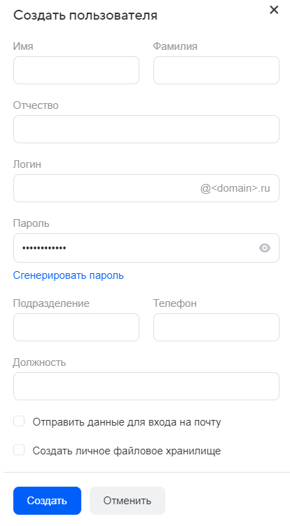 Минимальная длина пароля — 8 символов.Подразделение, Телефон, Должность Укажите эти данные, если необходимо. Отправить данные для входа на почту Всю информацию для входа пользователя в новый почтовый ящик можно отправить ему на почту. Для этого установите галочку. Создать личное файловое хранилище Установите галочку, чтобы автоматически создать облако для пользователя.