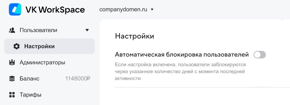 Вы можете настроить автоматическую блокировку неактивных пользователей. Пользователи, которые не используют почту, мессенджер и облако указанное вами количество дней, будут заблокированы. Отсчет начинается с даты последней активности.
