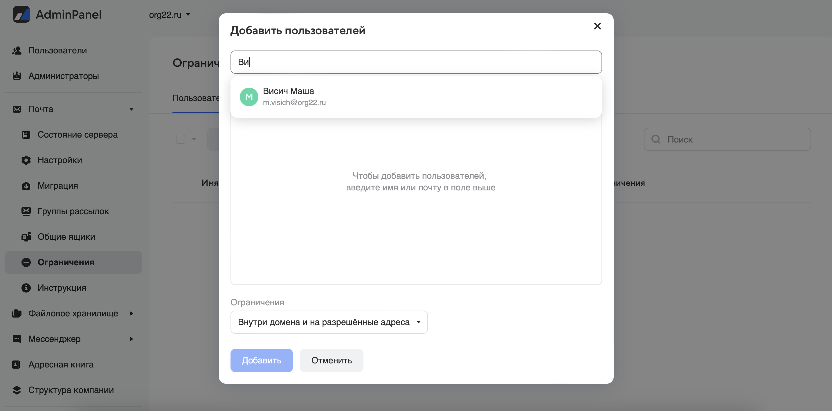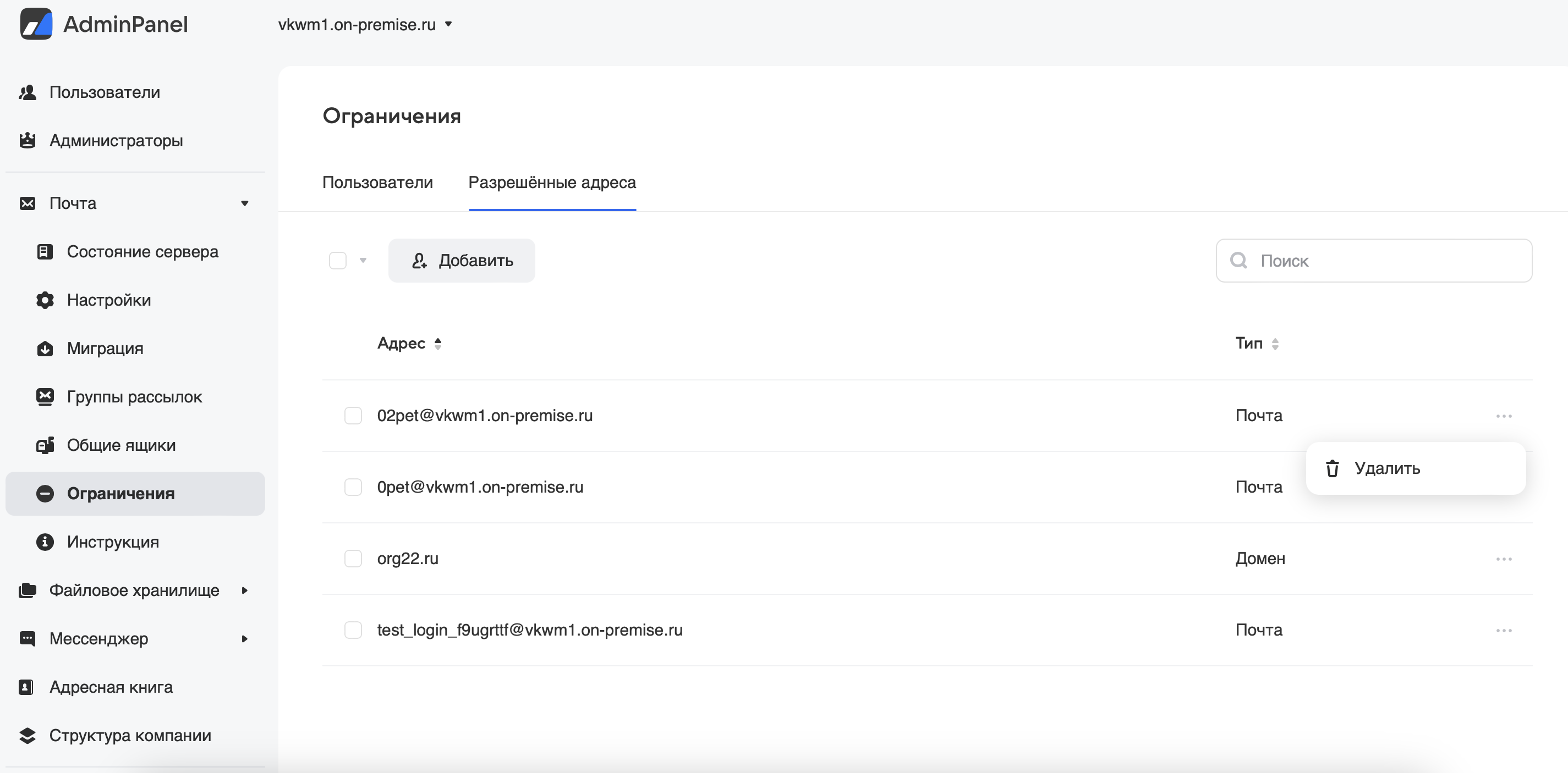 Если выбрано ограничение Внутри домена и на разрешенные адреса, перейдите на вкладку Разрешенные адреса и добавьте домены и e-mail адреса допустимые для отправки писем: