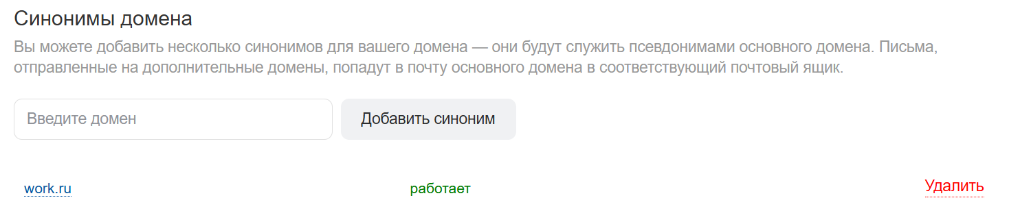 - Введите имя синонима. Если необходимо добавить несколько синонимов, перечислите синонимы через пробел или запятую — доменное имя подставится автоматически, если его не указывать.