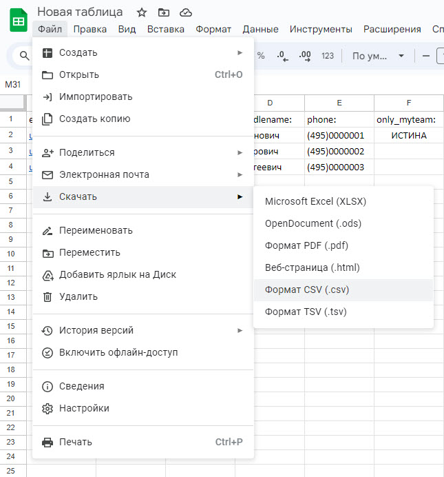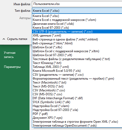 После создания таблицы перейдите к сохранению и выберите формат CSV: