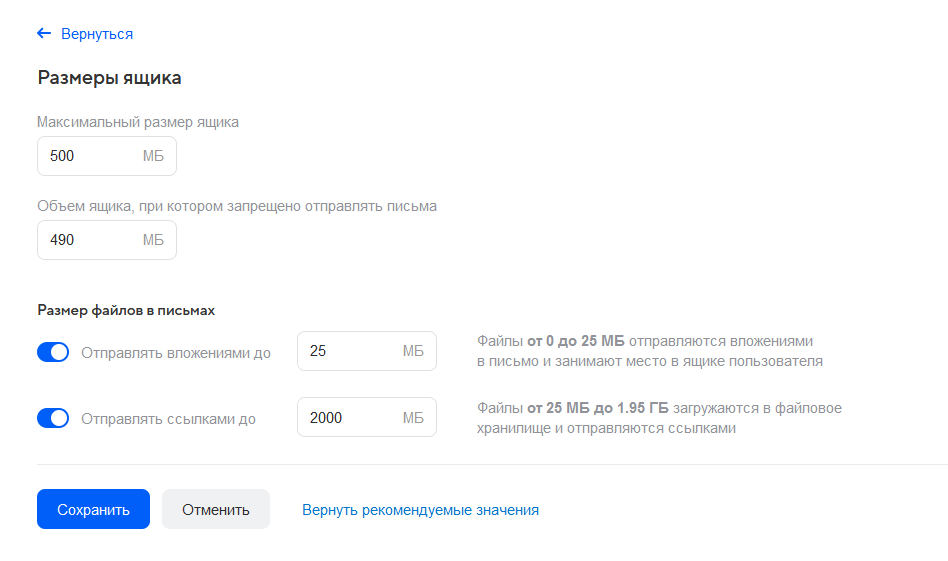 Если размеры ящика и вложений не заданы для конкретного пользователя, для него действуют общие правила, настроенные в разделе Почта → Настройки.