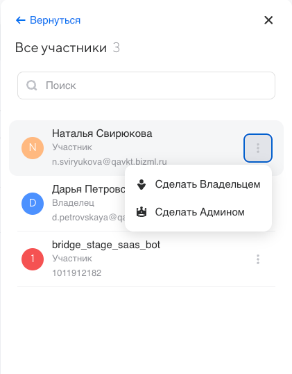 Если пользователь, который раньше был владельцем или администратором чата, удален из чата, вы можете назначить нового владельца и администратора.