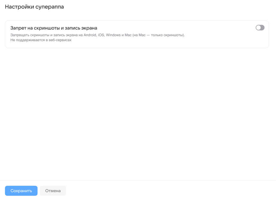 Перейдите в Панель администратора по адресу https://biz.<ваш домен>/ в раздел Суперапп и включите Запрет на скриншоты и запись экрана.