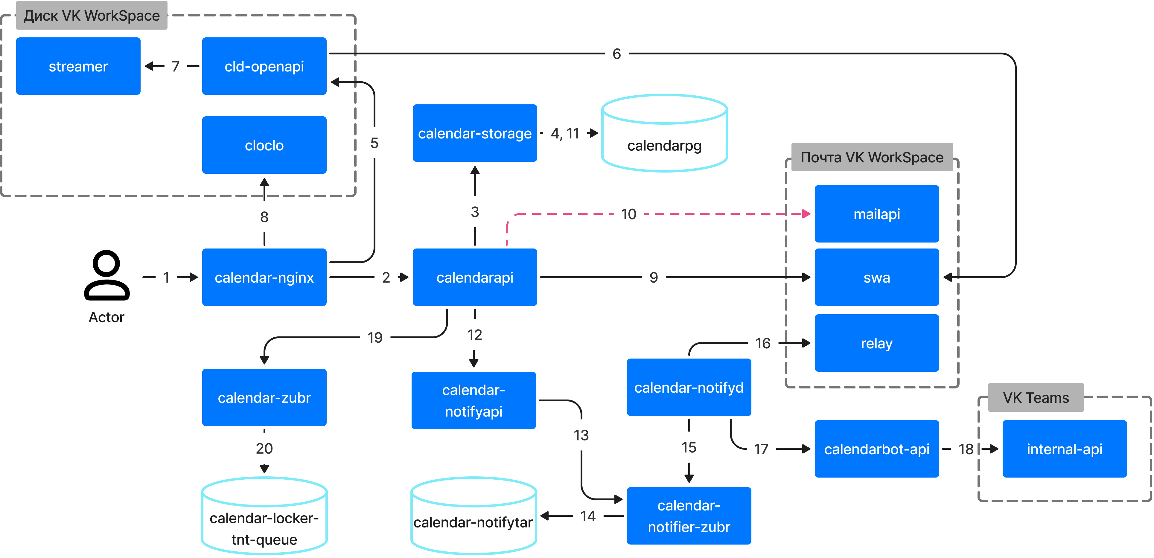 | 5 | сервер EWS | Передает события подписанных пользователей в Календарь VK WorkSpace | calendar-nginx — является точкой входа в сервисы Календаря |