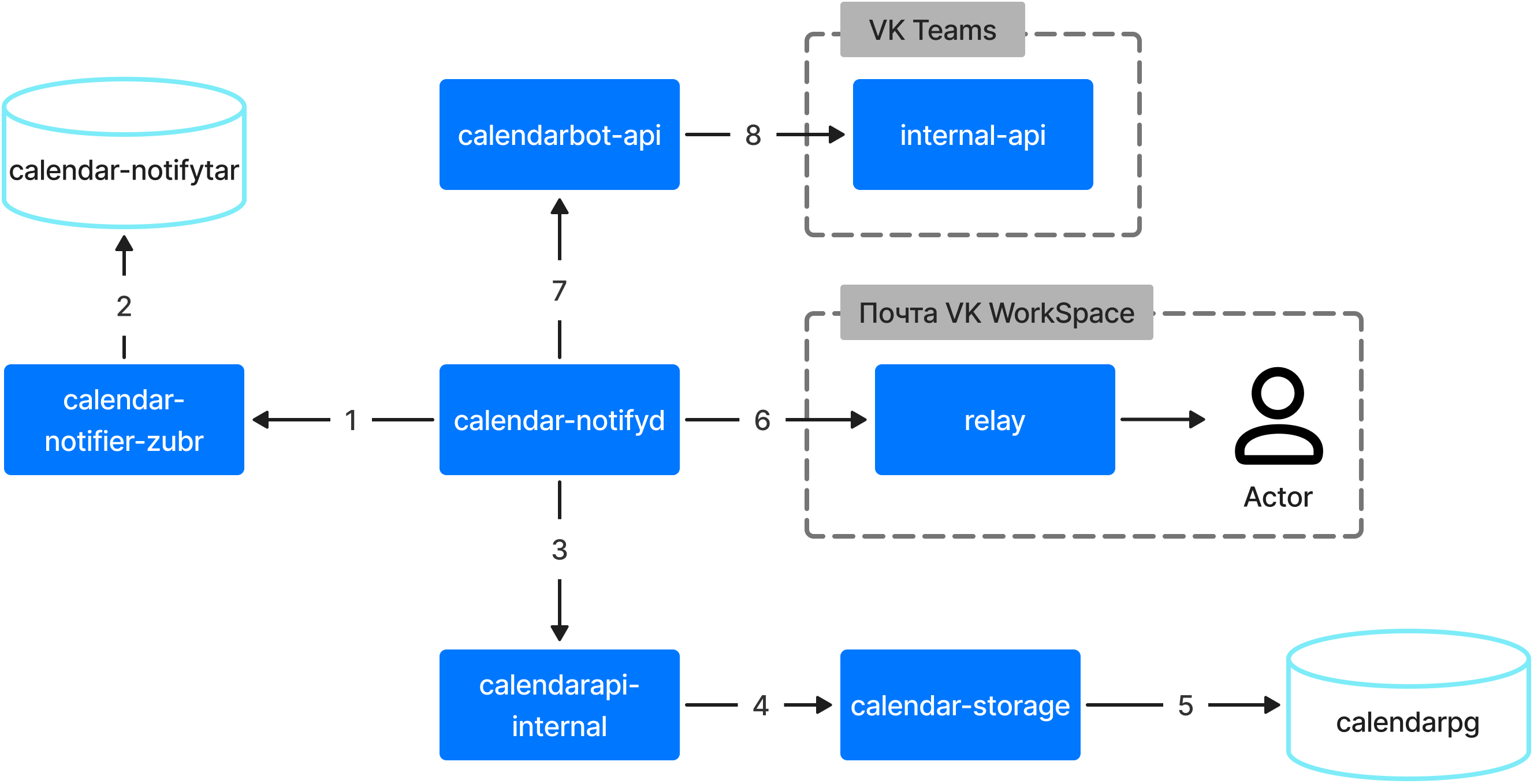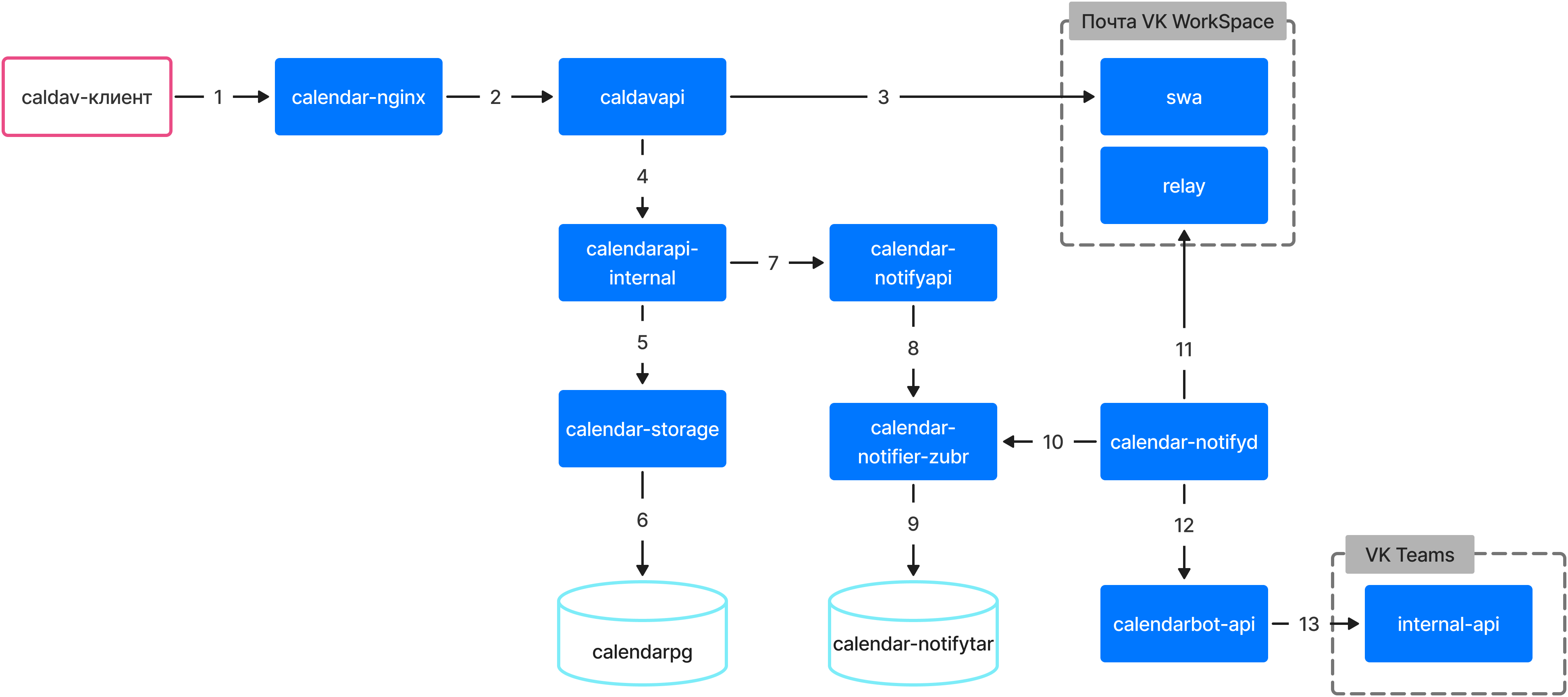 - После преобразования calendar-notifyd передает уведомления в сервис Почты VK WorkSpace relay.
