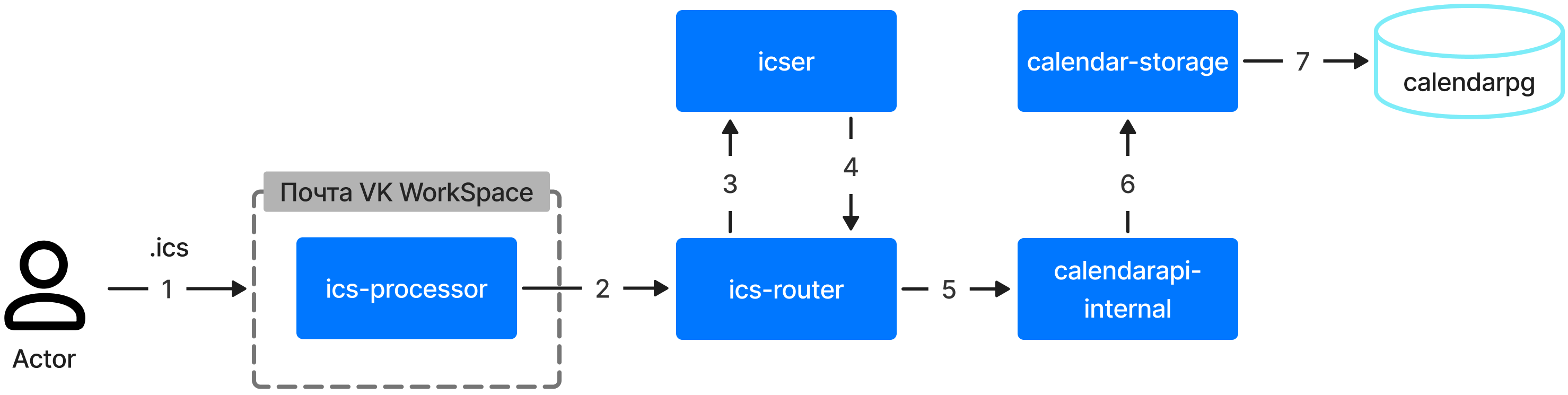 | 1 | Actor | HTTP | ics-processor — обработчик очереди писем с вложениями .ics из внешних календарей |