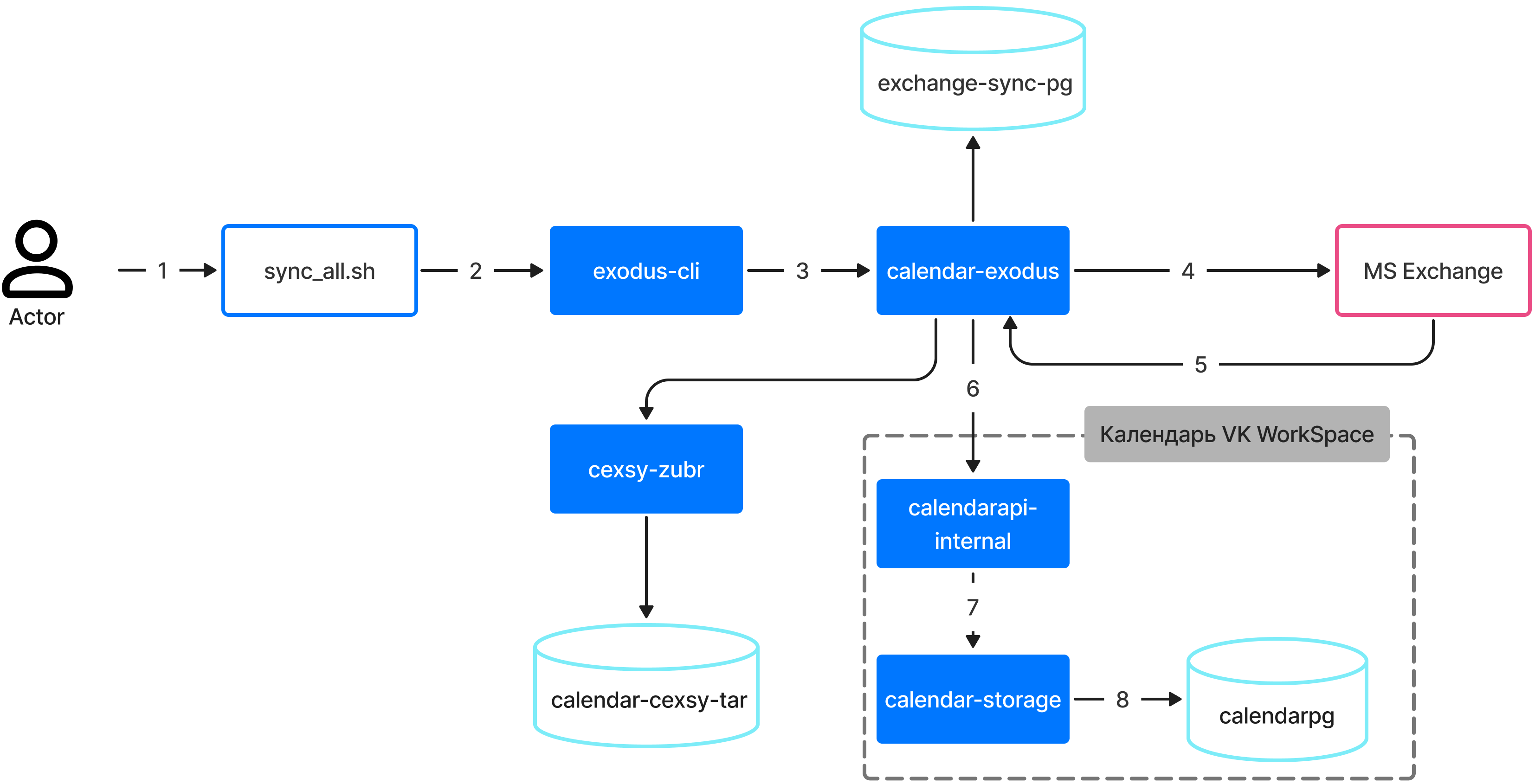 Так как в calendar-cexsy-tar и exchange-sync-pg происходит множество обращений в различные моменты работы миграции, стрелки не пронумерованы.