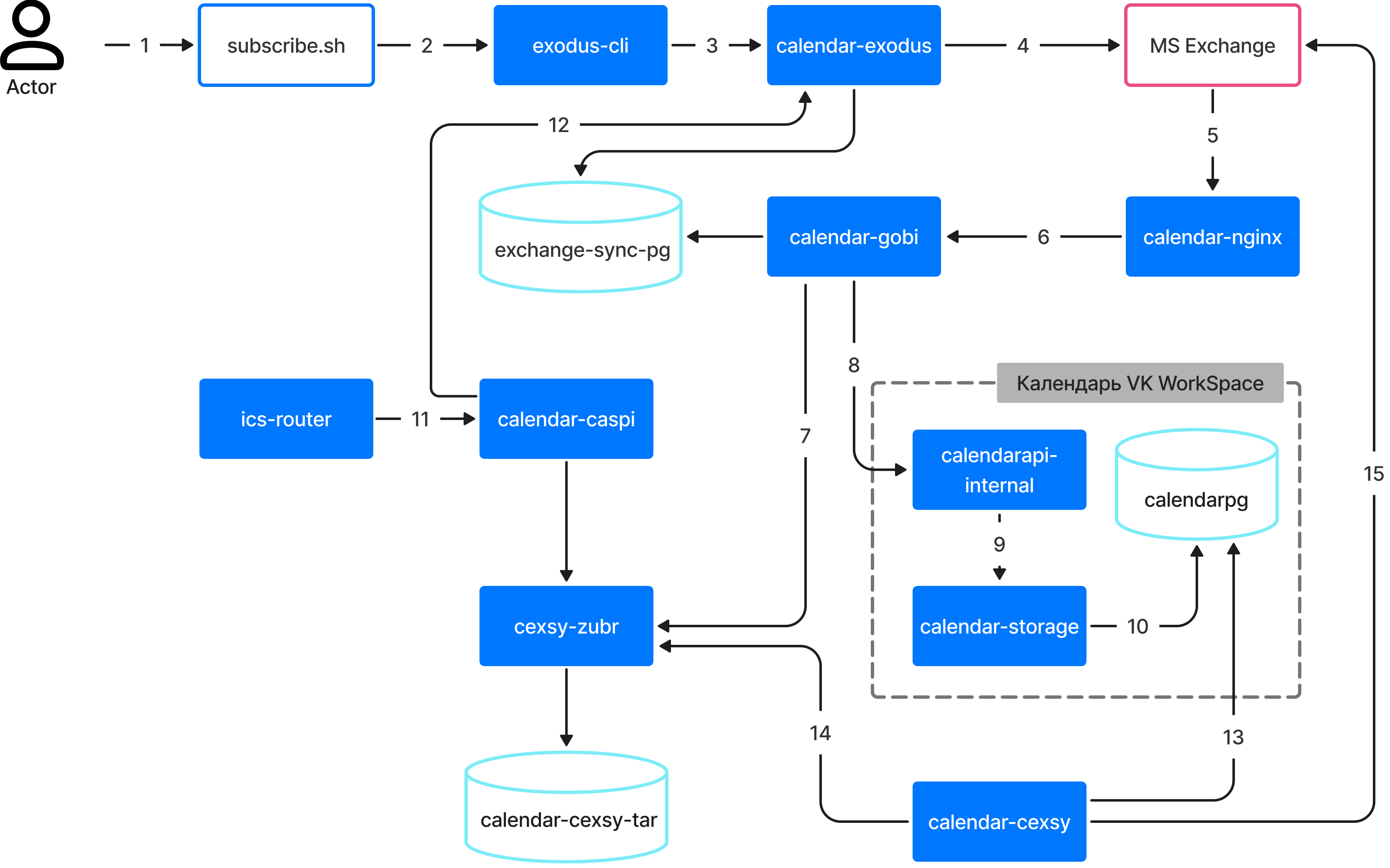 - За отправку событий из Календаря VK WorkSpace в MS Exchange отвечает сервис calendar-cexsy. Он опрашивает сервис calendarpg на наличие событий, созданных в Календаре.