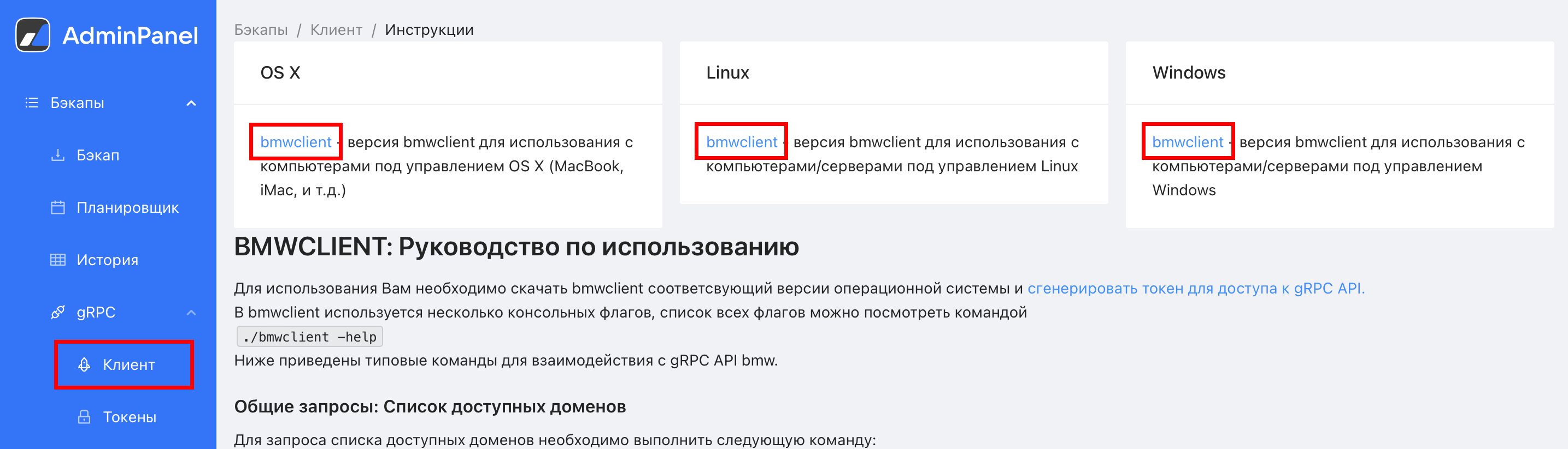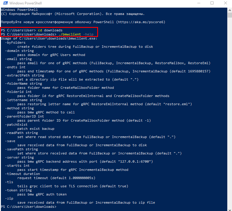 BMWCLIENT — это клиент для выполнения запросов к gRPC API. Основные функции клиента: резервное копирование и восстановление почтового ящика, облака, календарей, профилей пользователей и адресных книг.