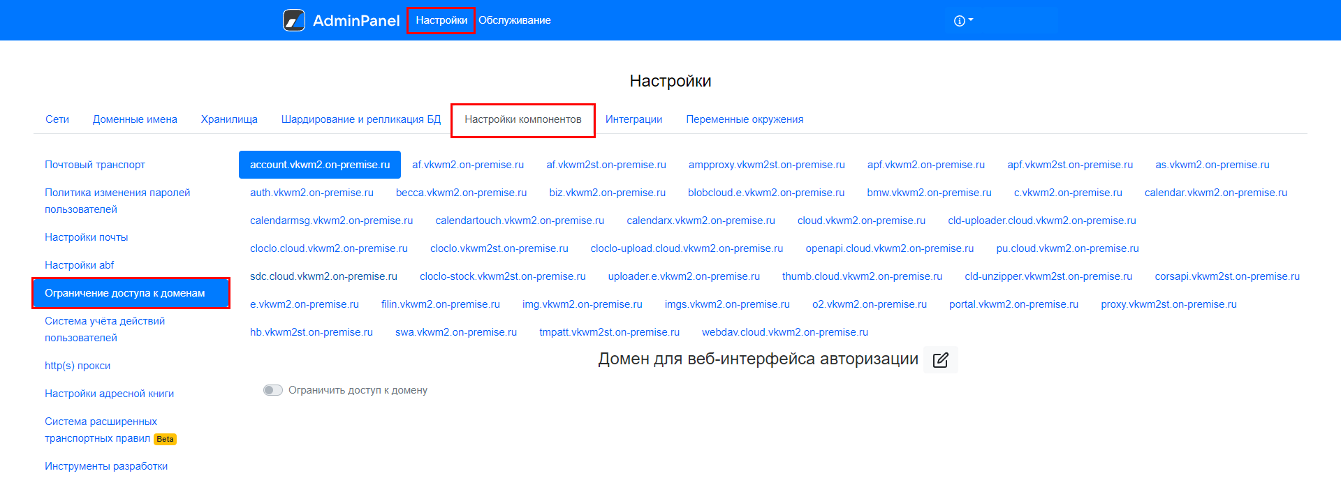 Перейдите на вкладку Настройки → Настройки компонентов → Ограничение доступа к доменам.