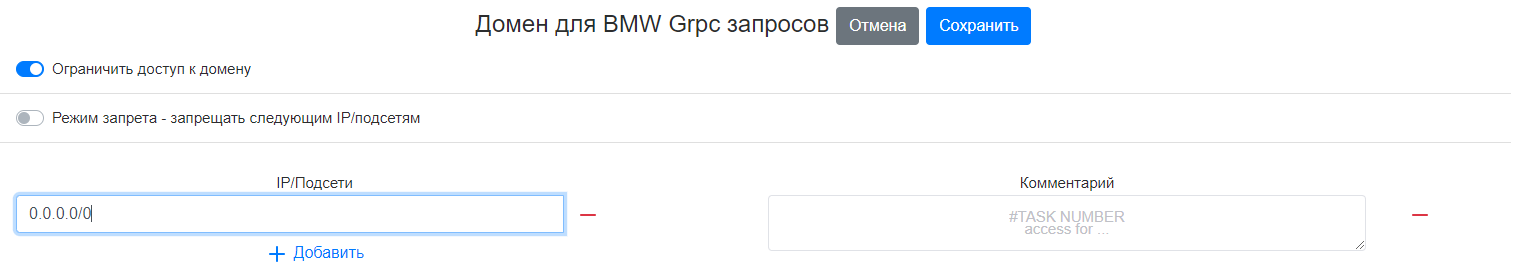 0.0.0.0/0. По умолчанию доступ к доменуbmw.server-adressзапрещен всем IP/подсетям. -