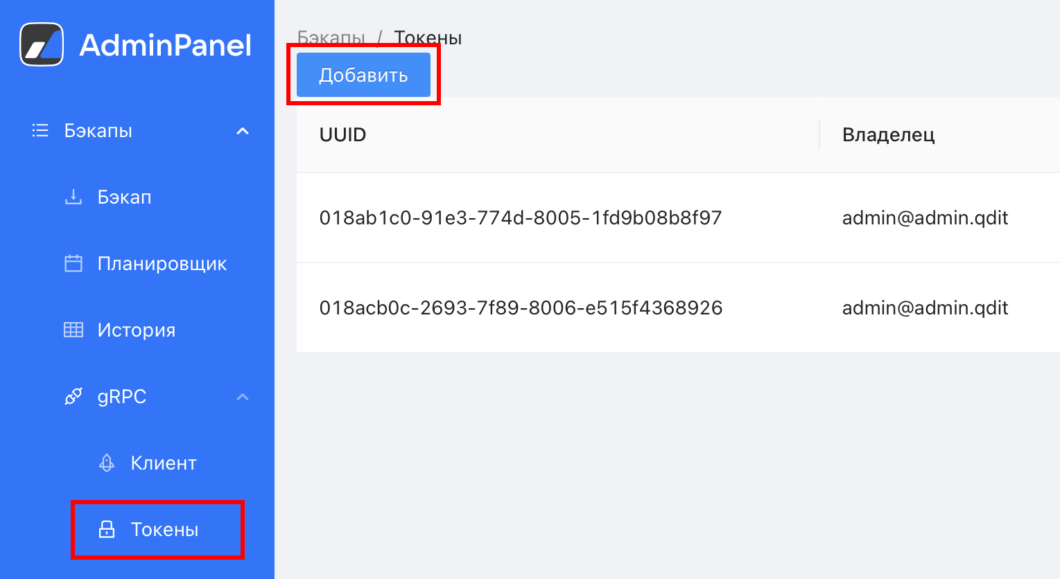 В меню слева выберите пункт Токены, на странице нажмите Добавить.