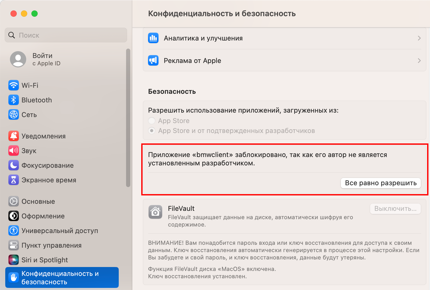 Кликните по кнопке Все равно разрешить для приложения bmwclient: