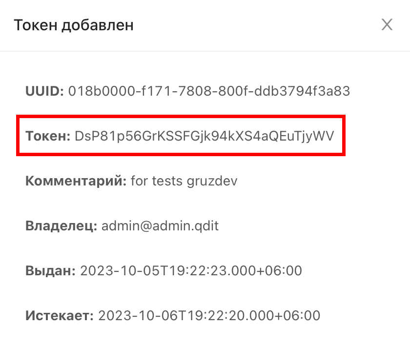 Нажмите Добавить. Отобразится окно со сгенерированным токеном.