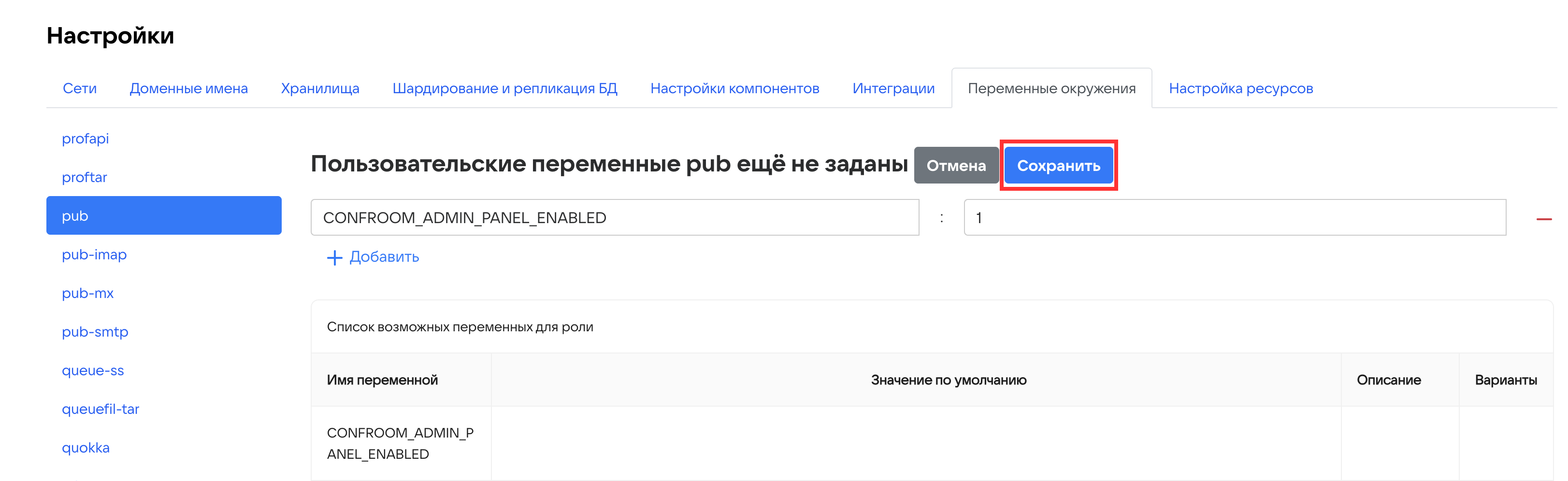 CONFROOM_ADMIN_PANEL_ENABLED, в поле Значение переменной введите значение1. - Нажмите Сохранить.