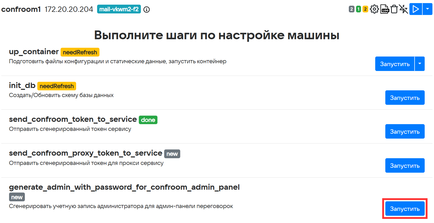 Если шаг generate_admin_with_password_for_confroom_admin_panel отсутствует или не выполняется, то выполните следующие команды на машине с контейнером confroom1: