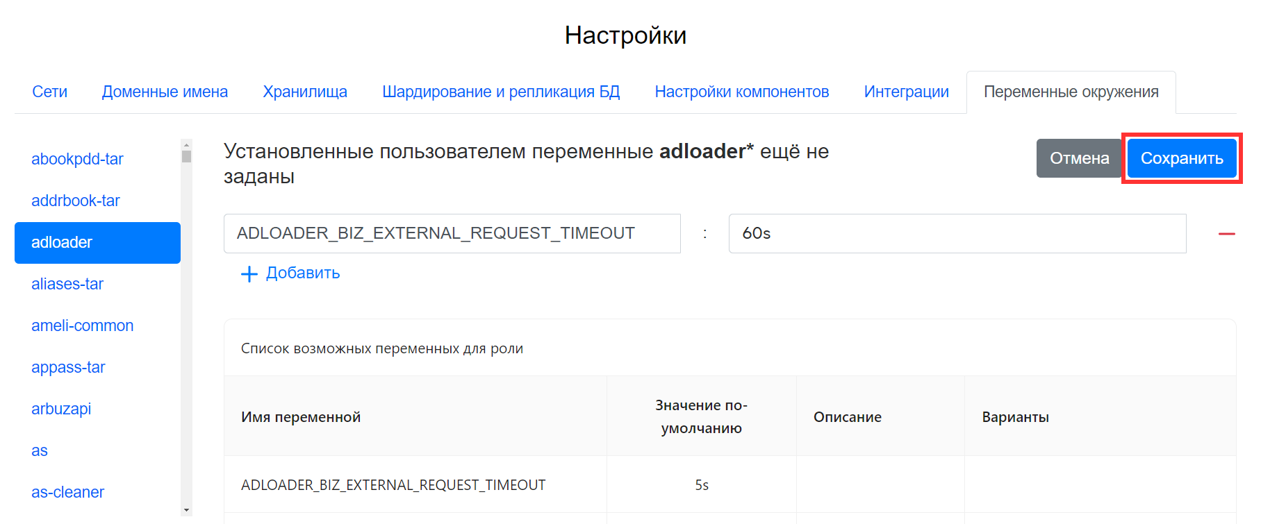 ADLOADER_BIZ_EXTERNAL_REQUEST_TIMEOUT, в поле Значение переменной введите60s. -