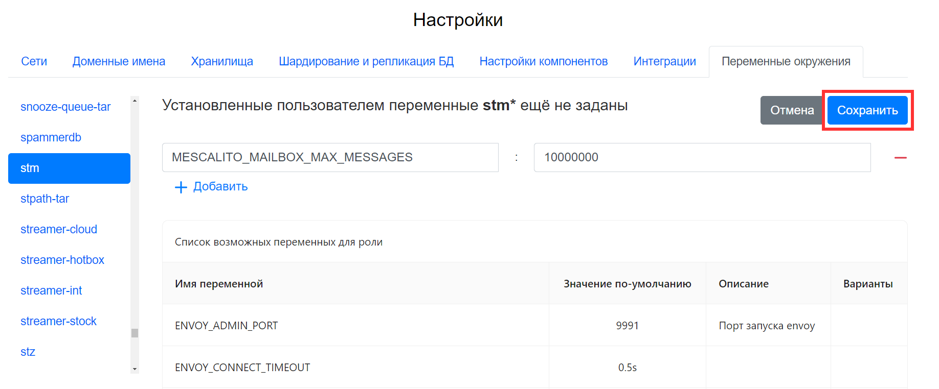 MESCALITO_MAILBOX_MAX_MESSAGES, в поле Значение переменной введите10000000. -