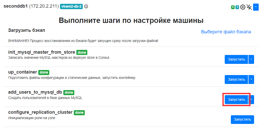 Нужно для каждой БД выполнить шаг add_users_to_mysql_db exec. Для примера логов выше, нужно выполнить этот шаг для следующих контейнеров: umi; seconddb; gravedb; rpopdb; fstatdb; bibliodb; swadb; bizdb; mirage.