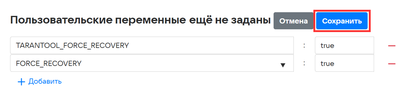 TARANTOOL_FORCE_RECOVERY, в поле Значение переменной введите значениеtrue. - Нажмите на кнопку + Добавить.