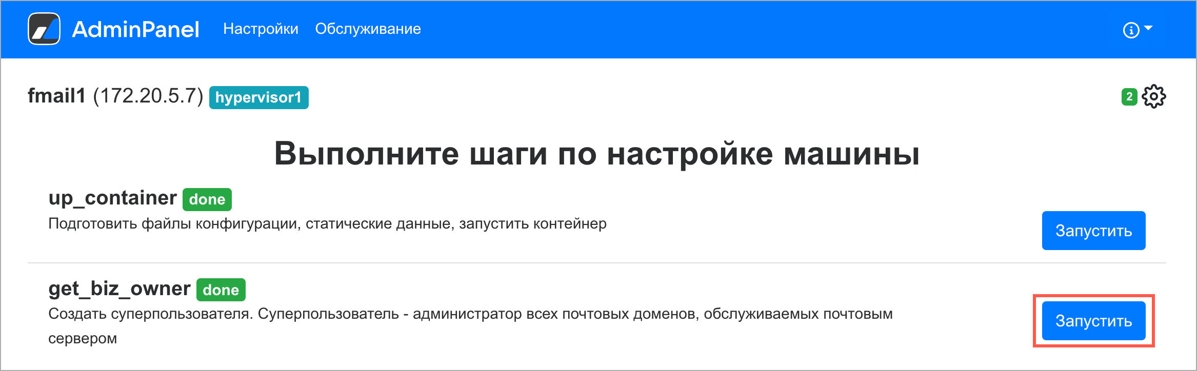 В веб-интерфйейсе установщика на верхней панели нажмите на вкладку Обслуживание, затем перейдите на вкладку Контейнеры.