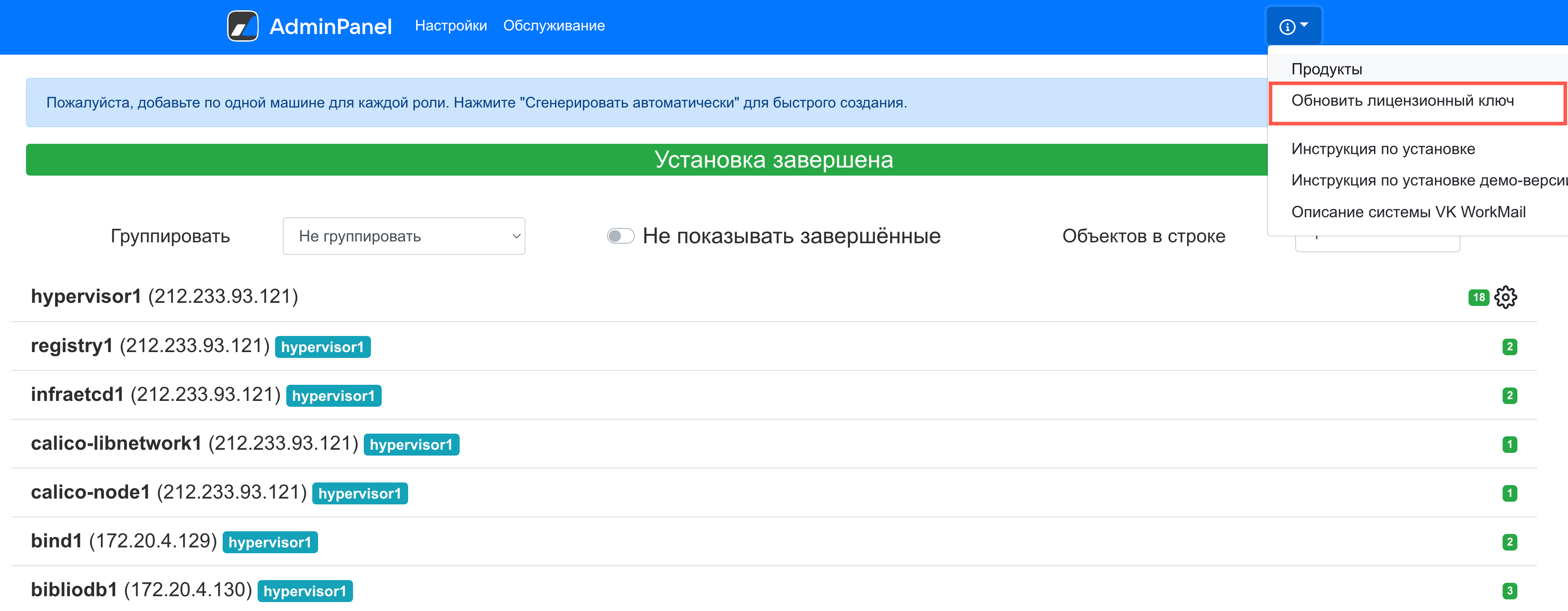 Если вам нужно обновить лицензионный ключ, в веб-интерфейсе установщика нажмите на значок