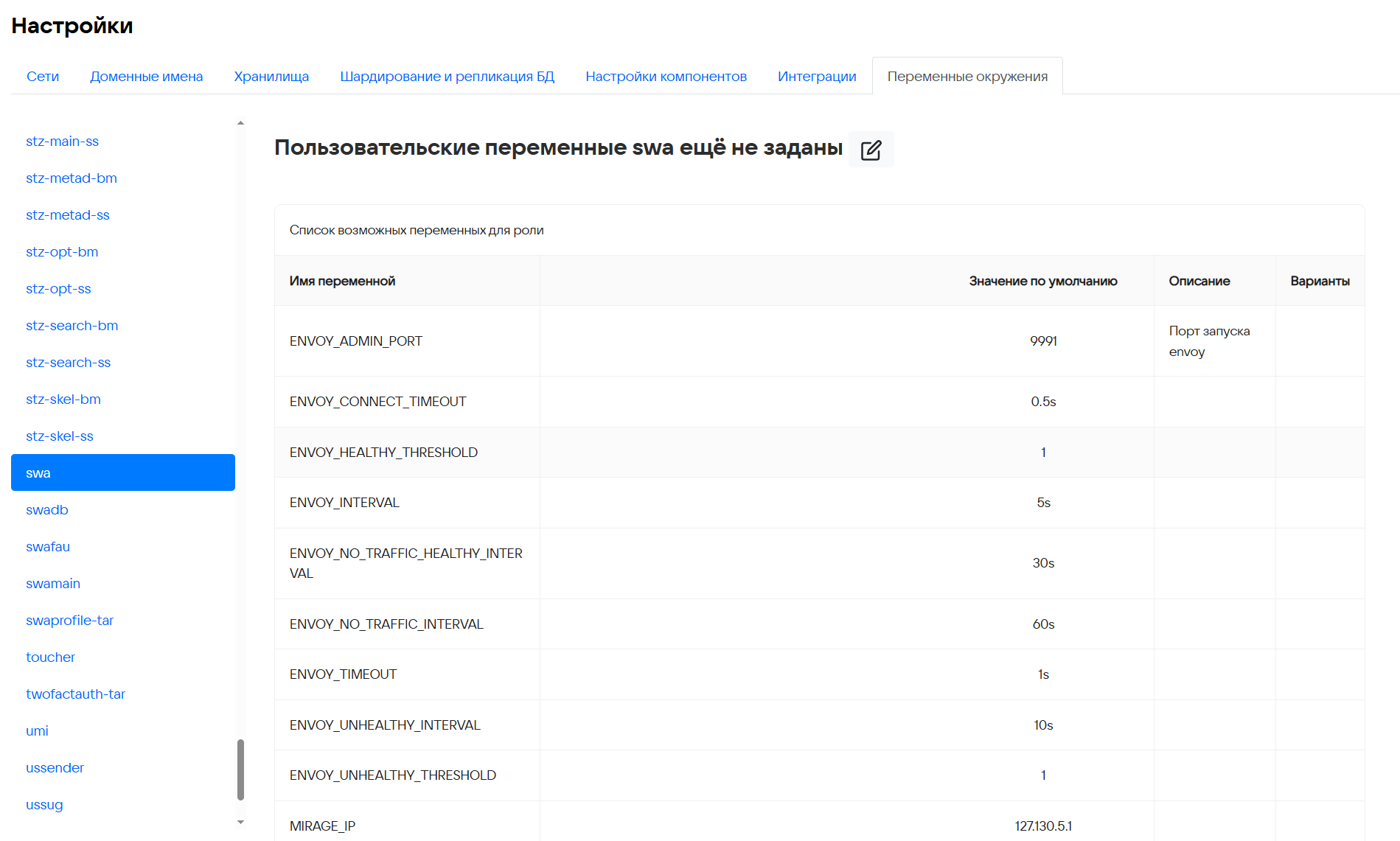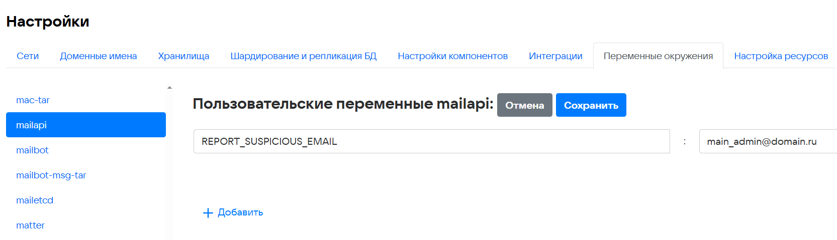 - В веб-интерфейсе установщика, перейдите в раздел Настройки -> Переменные окружения.