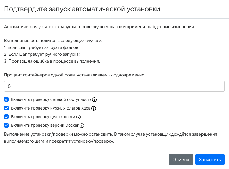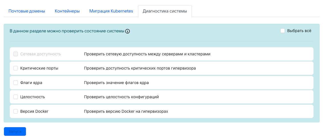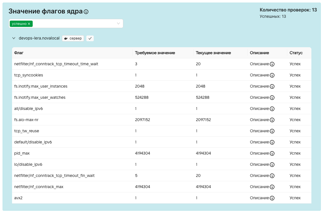 Проверяет корректность значений флагов ядра. Корректные значения указаны в документации по установке Почты VK WorkSpace: «Технические требования».