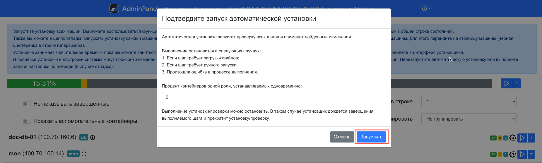 Подтвердите запуск автоматической установки, нажав на кнопку Запустить.