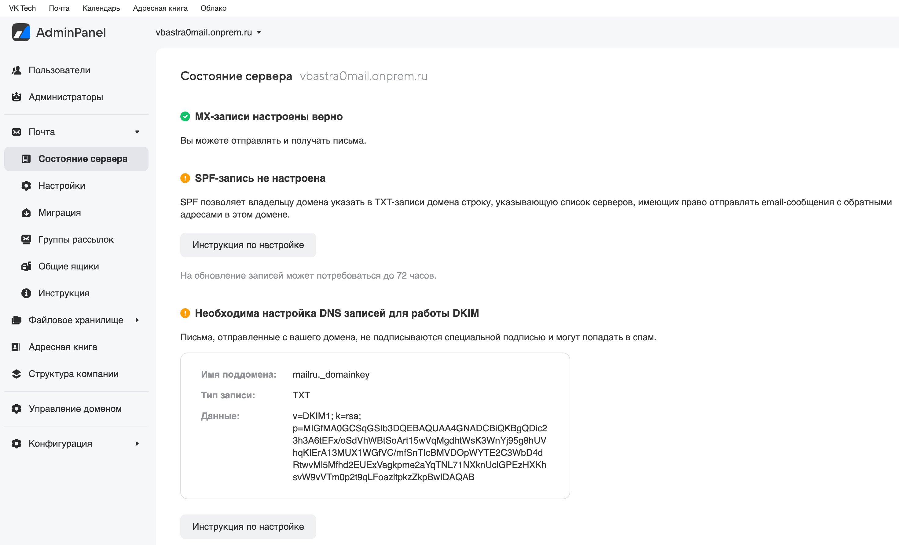 В панели администратора появится уведомление о том, что MX-запись настроена верно: