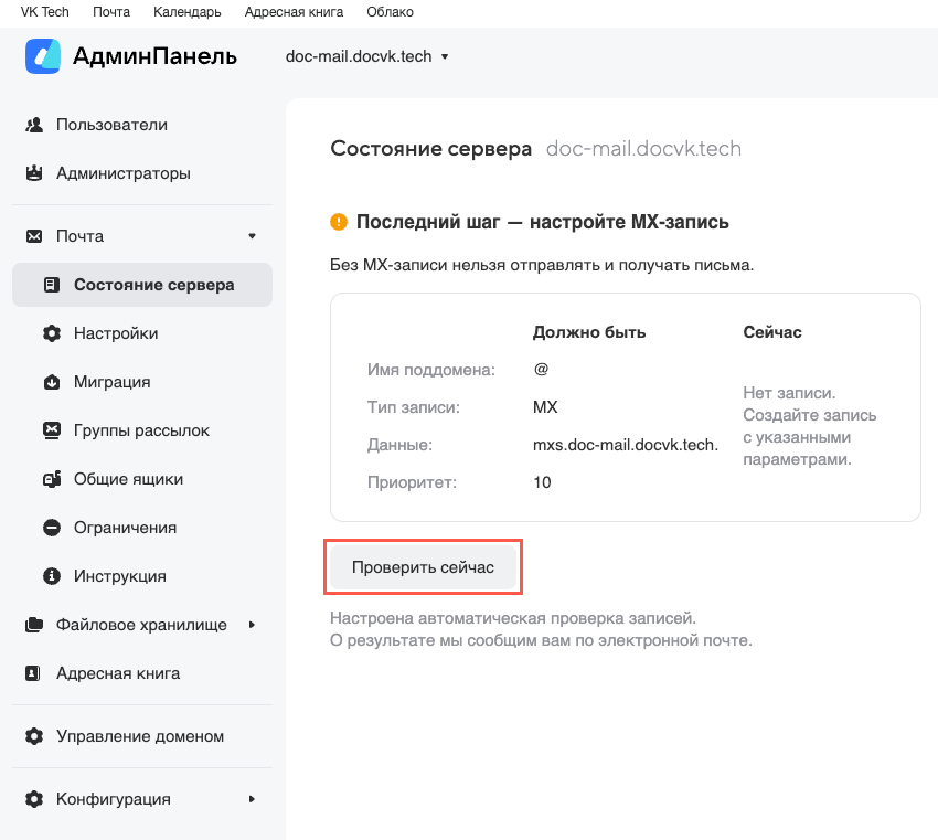Нажмите на кнопку Проверить сейчас, чтобы проверить MX-запись.