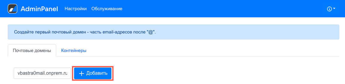Введите имя почтового домена и нажмите на кнопку Добавить.