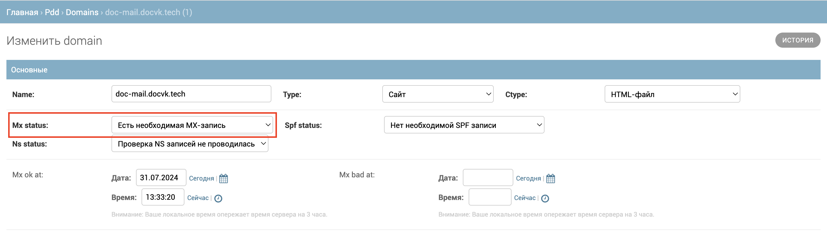 В поле Mx status выберите пункт Есть необходимая MX-запись.