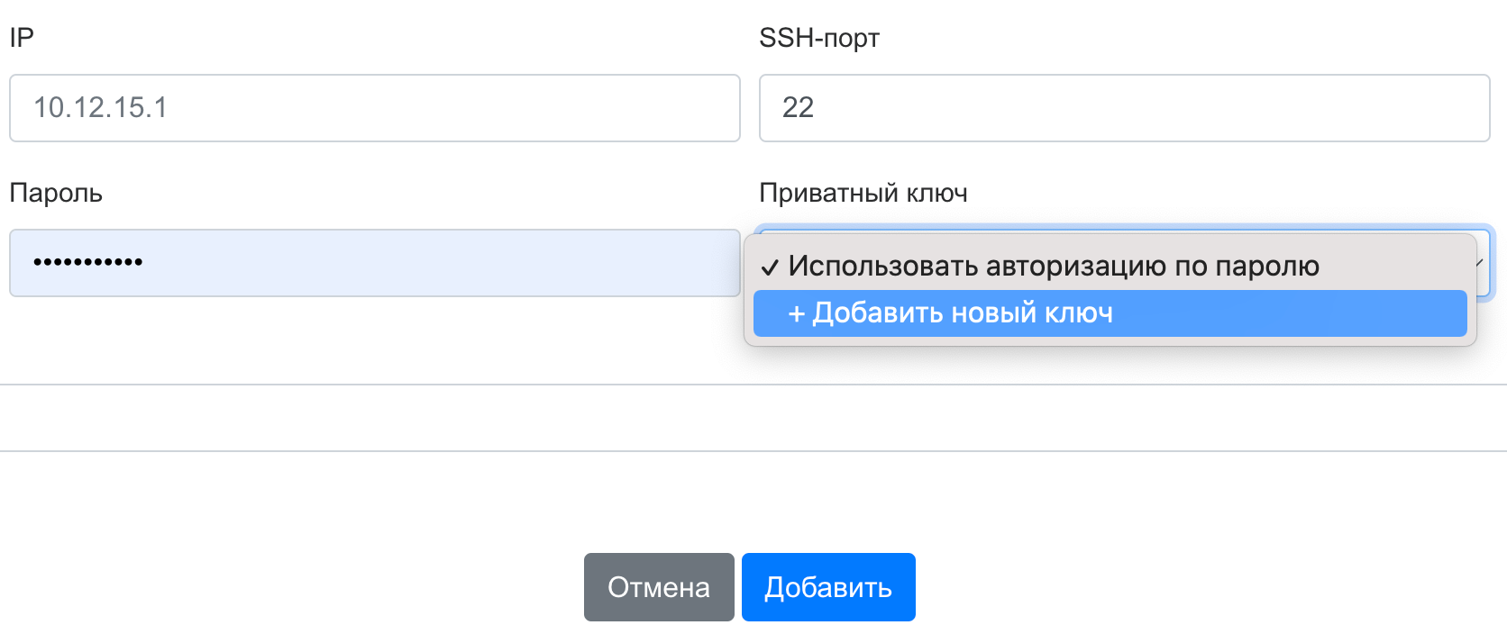 Приватный ключ должен быть добавлен в открытом виде, без секретной фразы. Закодированный ключ отличается от открытого наличием слова ENCRYPTED: BEGIN ENCRYPTED PRIVATE KEY.