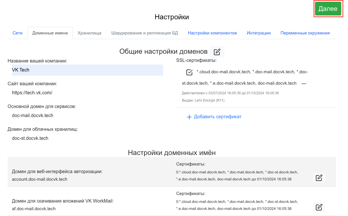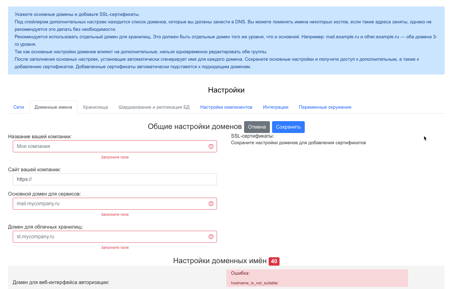 После сохранения доменных имен появятся ошибки. Они пропадут после добавления SSL-сертификатов на следующем шаге.